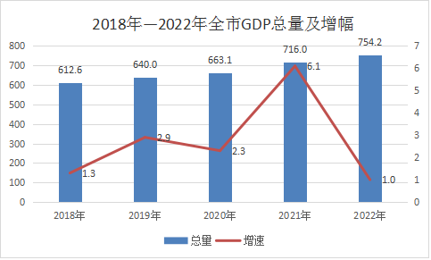 2022年初步核算,全市地区生产总值(GDP)实现754.2亿元,按可比价格计算,比上年增长1.0%。其中,第一产业实现增加值183.1亿元,比上年增长2.1%;第二产业实现增加值219.3亿元,比上年下降4.3%;第三产业实现增加值351.8亿元,比上年增长3.3%。三次产业增加值占地区生产总值(GDP)的比重分别为24.3%、29.1%和46.6%。全年全市人均GDP32671元,比上年增长3.1%。