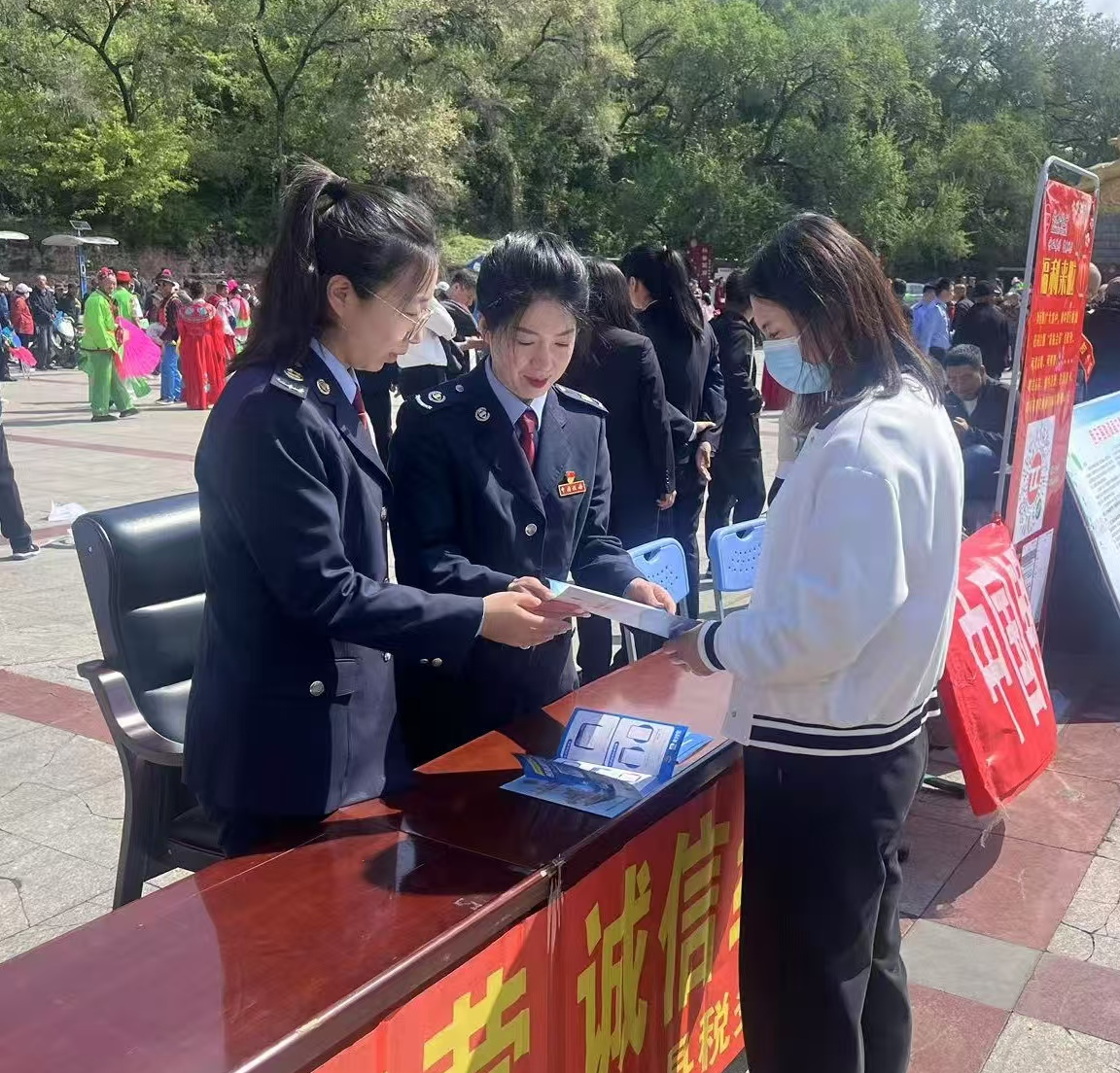 (一)西丰县税务局秉承为民服务宗旨,通过设立咨询台、摆放宣传展板、发放宣传资料等形式,向过往群众宣传个人所得税、社会保险费、房产税等与日常生活息息相关的税收政策,还对个体工商户关心的各项政策和反映较多的涉税需求进行了详细介绍和讲解。税务干部耐心细致的解答赢得了现场群众的一致好评,进一步营造浓厚活动氛围。