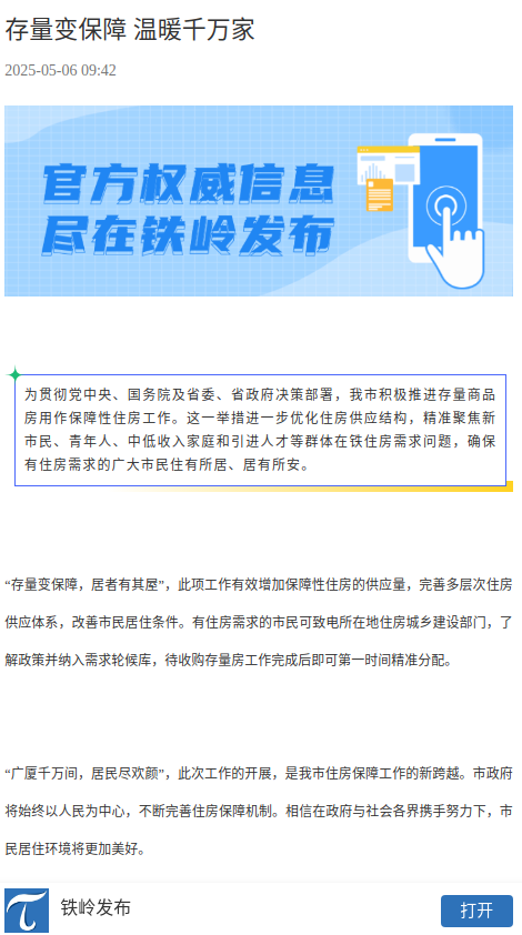 为贯彻党中央、国务院及省委、省政府决策部署,积极推进我市存量商品房用作保障性住房工作,精准聚焦新市民、青年人、中低收入家庭和引进人才等群体在铁住房需求问题,确保有住房需求的广大市民住有所居、居有所安。5月6日住建局邀请各县(市)区的住房和城乡建设局、银州区房产局、开发区城市与交通发展服务中心局6家有关负责同志,对惠企利民举措进行解读,并通过官媒“铁岭发布”向社会公开发布。其中,“存量变保障,居者有其屋”,此项工作有效增加保障性住房的供应量,完善多层次住房供应体系,改善市民居住条件。有住房需求的市民可致电所在地住房城乡建设部门,了解政策并纳入需求轮候库,待收购存量房工作完成后即可第一时间精准分配。此次工作的开展,是提升基本住房保障效能、扩大住房保障覆盖率的攻坚行动。也是我市住房保障工作的新跨越。以后更要强化指导管理、动态跟踪进度,确保住房保障工作规范有序推进,高质量完成年度各项目标任务。