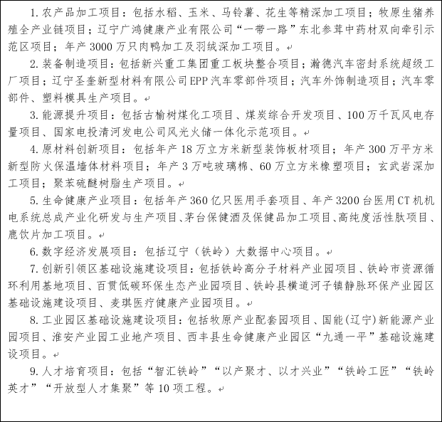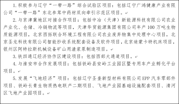 推进与京津冀地区对接合作。围绕推动铁岭特色装备制造、专用汽车及汽车零部件、原材料工业、农产品加工业等产业转型升级,主动承接京津冀、长三角等地区的产业、资本、人才、技术等资源的转移和辐射。大力发展绿色农业、特色农业、品牌农业。围绕开原、昌图、西丰农业产业集群,建设专供京津冀的区域农产品流通中心。加强新能源、通用航空、电子信息(大数据)、生物医药、节能环保、现代物流、文化旅游、健康养老等领域的对接与合作,培育壮大铁岭新兴产业,提升现代服务业发展水平。坚持大项目带动、配套企业跟进、产业集群发展,通过精准招商完善产业链,扶持一批大型骨干企业,推动铁岭比较优势产业转型升级。