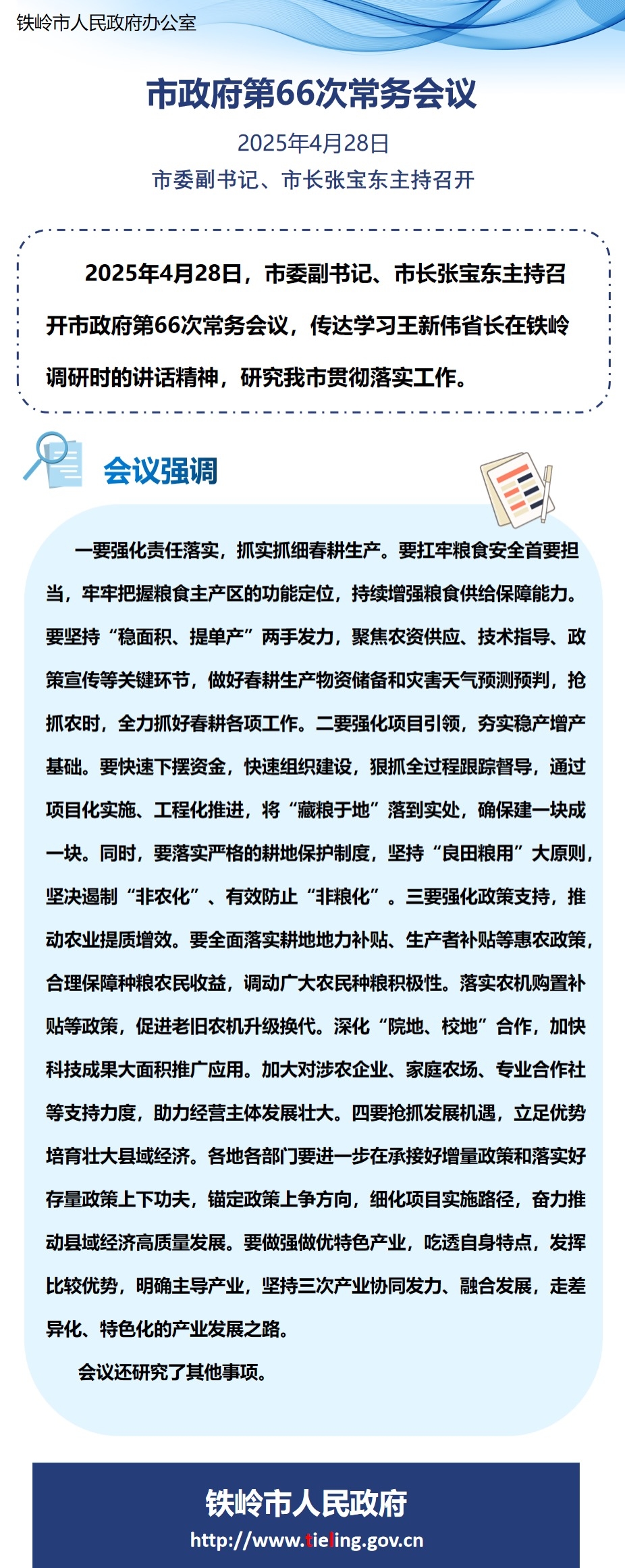 2025年4月28日,市委副书记、市长张宝东主持召开市政府第66次常务会议,传达学习王新伟省长在铁岭调研时的讲话精神,研究我市贯彻落实工作