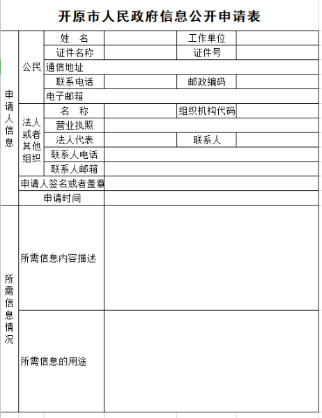 申请人通过信函和电子邮件提出申请的,应填写《开原市人民政府信息公开申请表》(以下简称《申请表》,详见附件1),书面《申请表》可在受理地点领取或从开原市人民政府门户网站“政府信息公开指南”栏目(http://www.lnky.gov.cn/tlkys/zfxxgk78/zfxxgkzn29/index.html)下载打印。