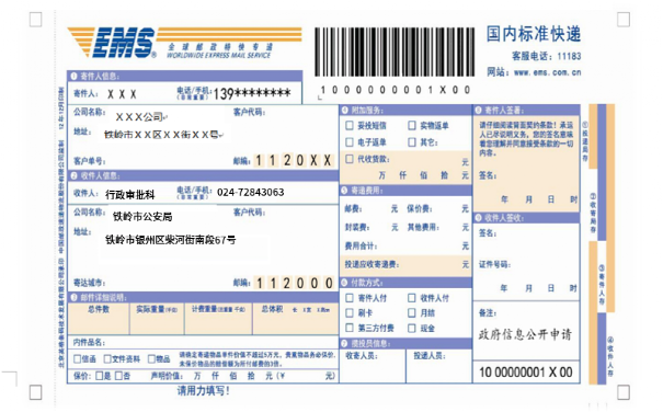 申请人可以通过信函方式提出申请。在信封显著位置注明“政府信息公开申请”字样,邮寄至铁岭市公安局行政审批科。信函应通过中国邮政的挂号信或EMS特快专递邮寄,不受理快递文件形式的申请。特快专递申请式样详见附件2。