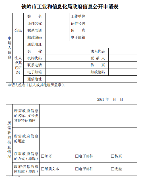 申请人通过现场、信函、传真和电子邮件提出申请的,应填写《铁岭市工业和信息化局政府信息公开申请表》(以下简称《申请表》,详见附件1),书面《申请表》可在市工业和信息化局办公室领取或从附件中下载打印。
