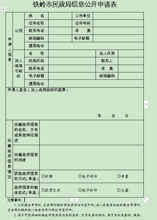申请人通过现场、信函、传真和电子邮件提出申请的,应填写《铁岭市民政局信息公开申请表》(以下简称《申请表》,详见附件1),书面《申请表》可在受理地点领取或从铁岭市民政局政府门户网站“政府信息公开指南”栏目(http://mzj.www.jeebzi.com/tlmzj/zfxxgk6359/zfxxgkzn58/index.html)下载打印。