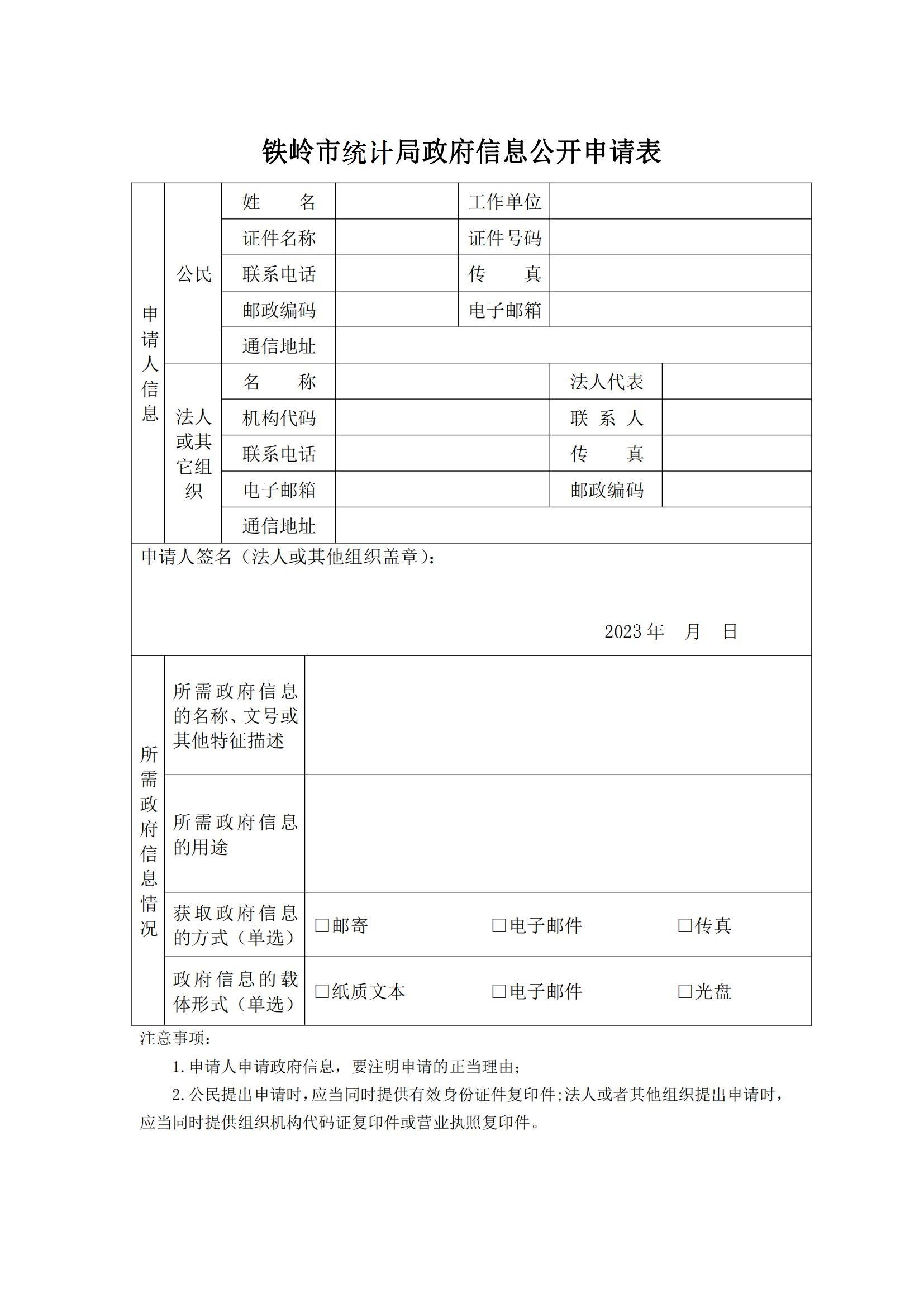 申请人通过现场、信函、传真和电子邮件提出申请的,应填写《铁岭市统计局政府信息公开申请表》(以下简称《申请表》,详见附件1),书面《申请表》可在受理地点领取或从铁岭市统计局门户网站“政务公开”“政府信息公开指南”栏目下载打印。