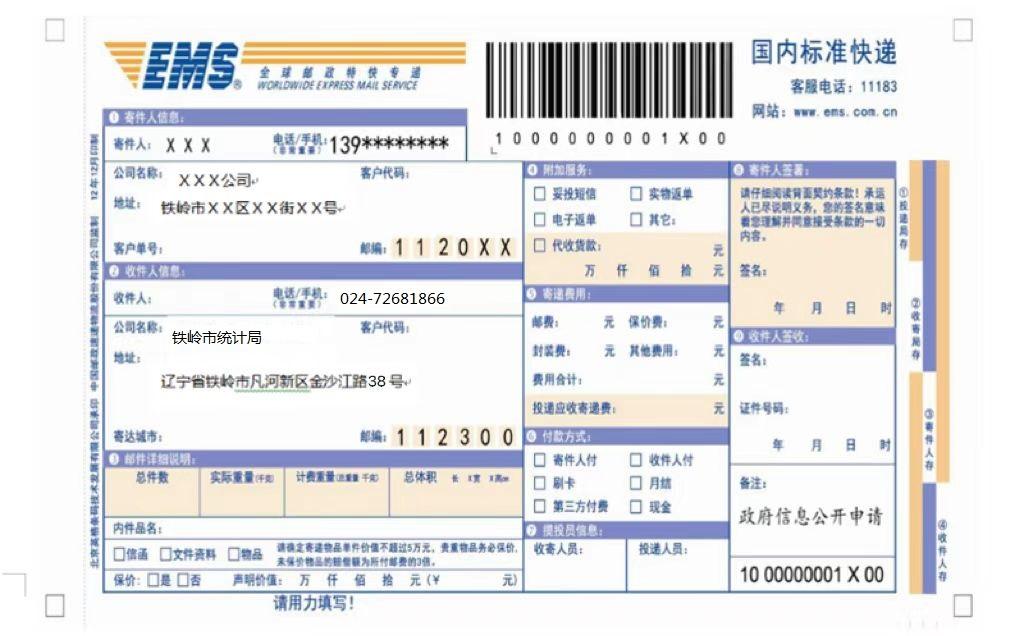 申请人可以通过信函方式提出申请。在信封显著位置注明“政府信息公开申请”字样,邮寄至铁岭市统计局办公室。信函应通过中国邮政的挂号信或EMS特快专递邮寄,不受理快递文件形式的申请。特快专递申请式样详见附件2。