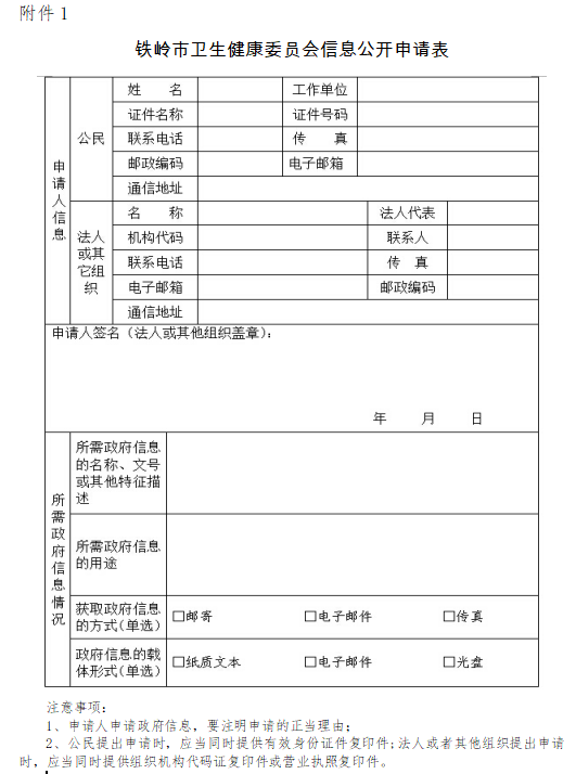 申请人通过现场、信函、传真和电子邮件提出申请的,应填写《铁岭市卫生健康委信息公开申请表》(以下简称《申请表》),书面《申请表》可在受理地点领取或从铁岭市卫生健康委网站主页右下角“表格下载”栏目下载打印。