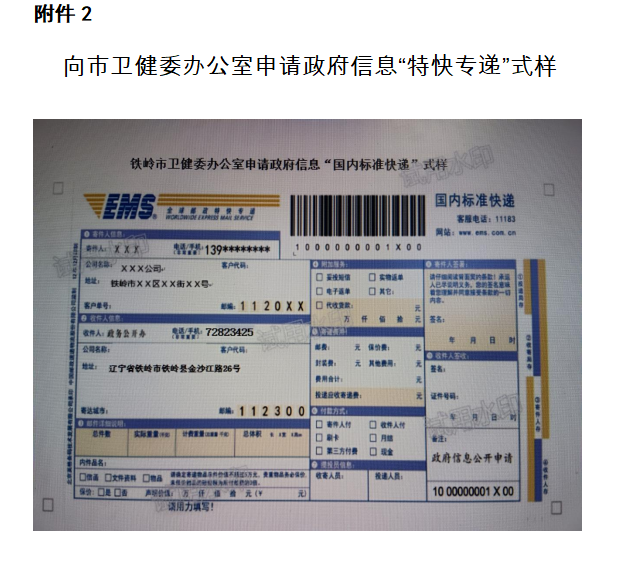 申请人可以通过信函方式提出申请。在信封显著位置注明“卫生健康信息公开申请”字样,邮寄至铁岭市卫生健康委办公室。信函应通过中国邮政的挂号信或EMS特快专递邮寄,不受理快递文件形式的申请。特快专递申请式样。