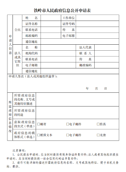 申请人通过信函、传真和电子邮件提出申请的,应填写《铁岭市政府信息公开申请表》(以下简称《申请表》,详见附件1),书面《申请表》可在附件中下载打印。